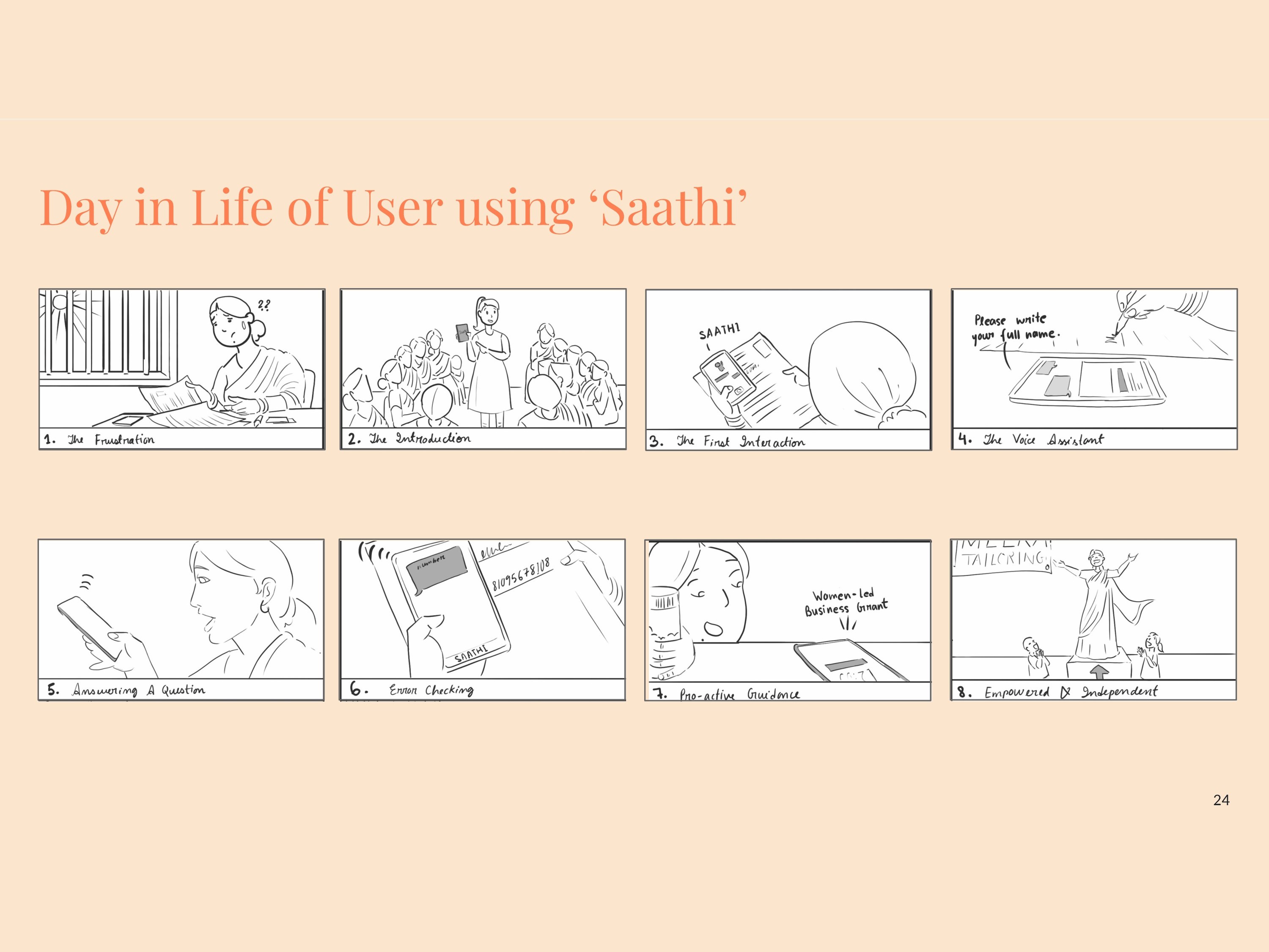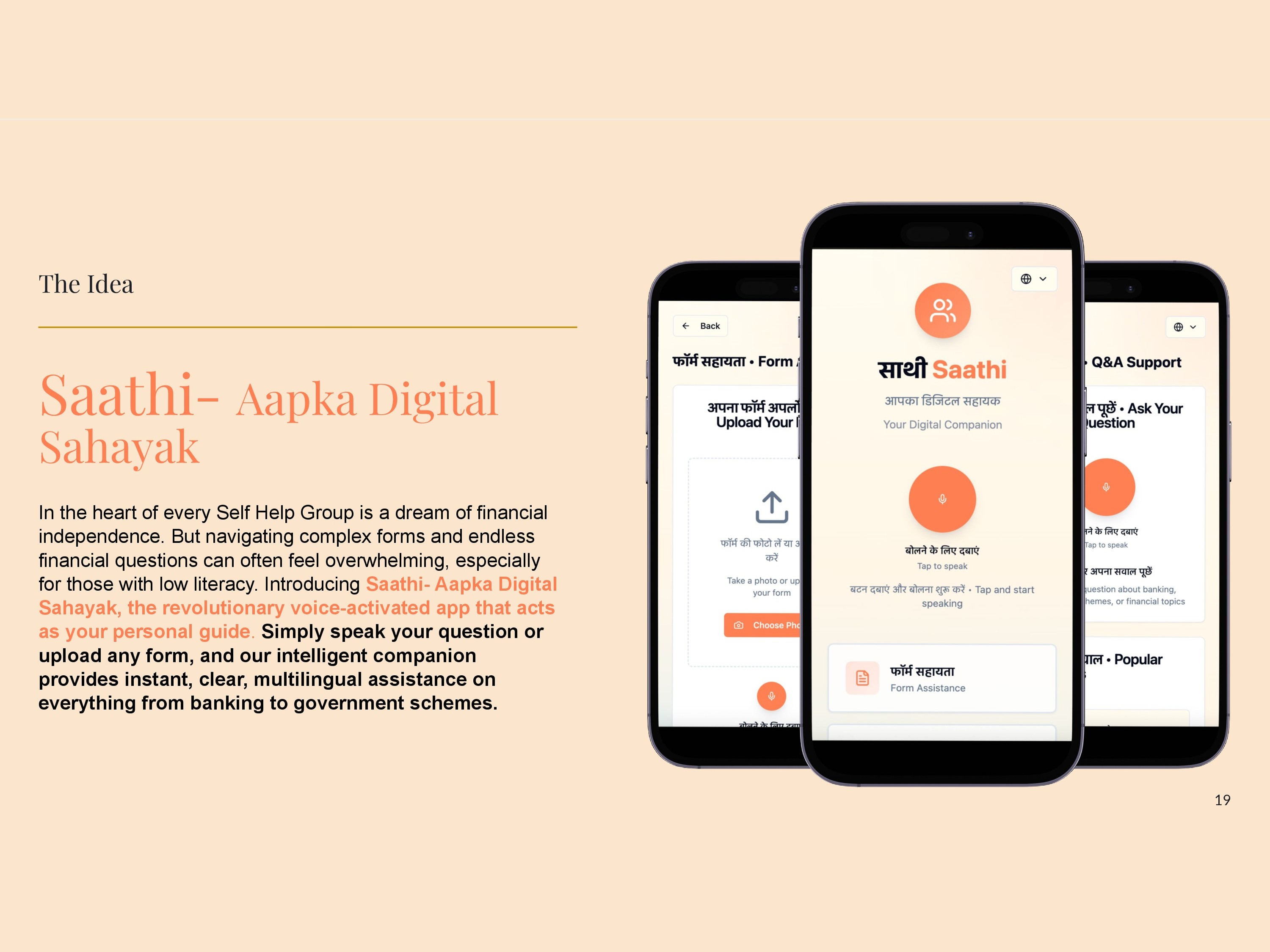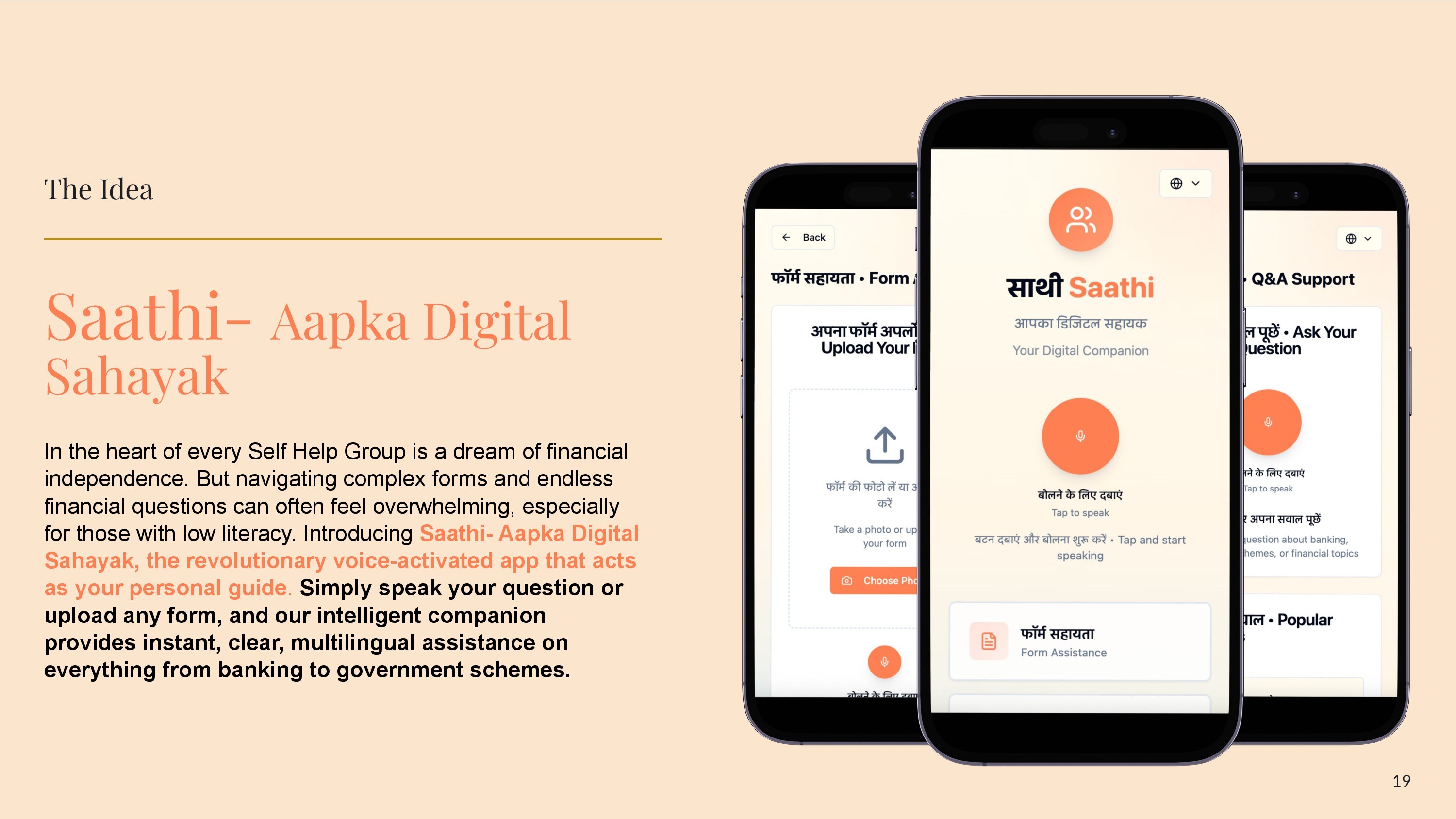 Through extensive user research, persona development, and iterative concept building, we designed Saathi, a voice-enabled AI assistant that helps women understand documents, fill forms, and access financial knowledge. The multilingual interface, OCR-based form assistance, and conversational guidance reduce dependency on intermediaries and empower users to navigate systems independently.
