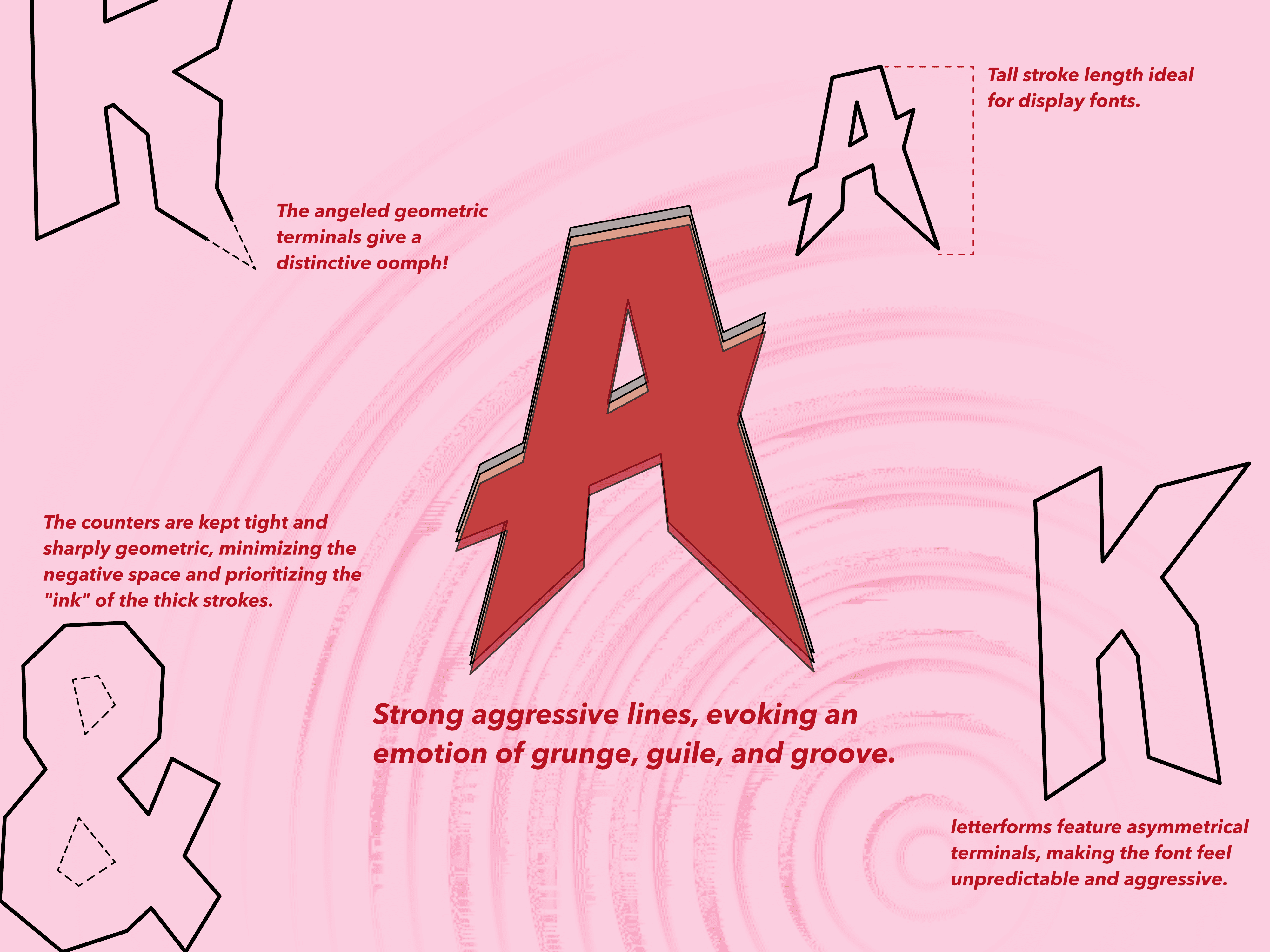 Create a distinctive display typeface that captures the rebellious spirit and visual intensity of 1980s rock and metal while remaining structured enough for contemporary design applications.